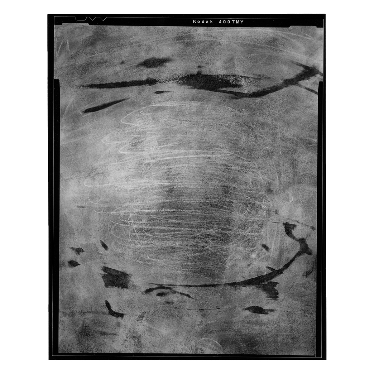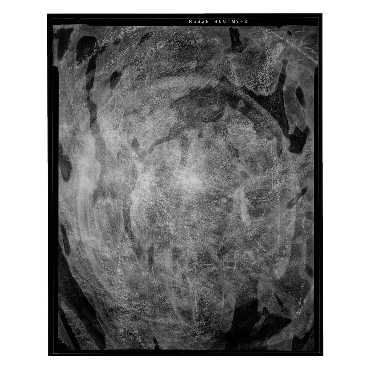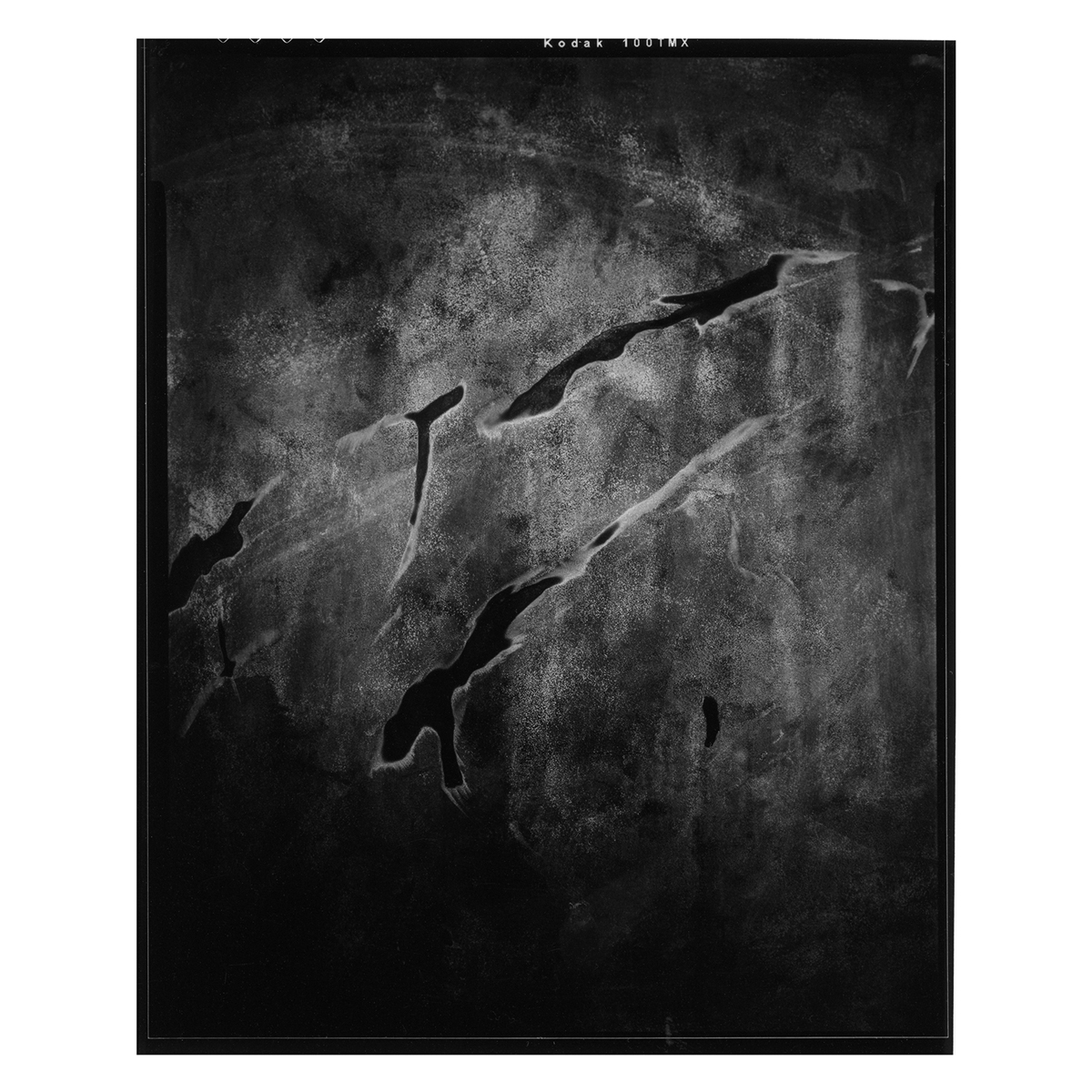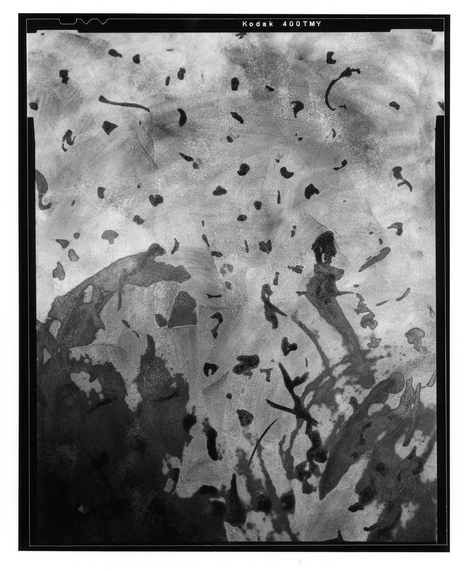 As the water dissipated and morphed, she photographed the spontaneous abstractions with 4” x 5” black and