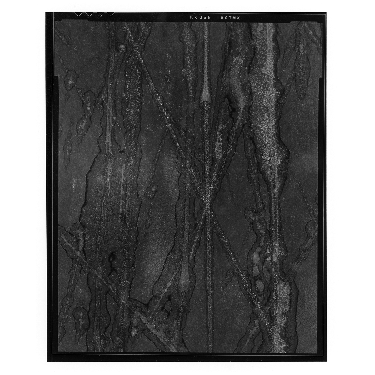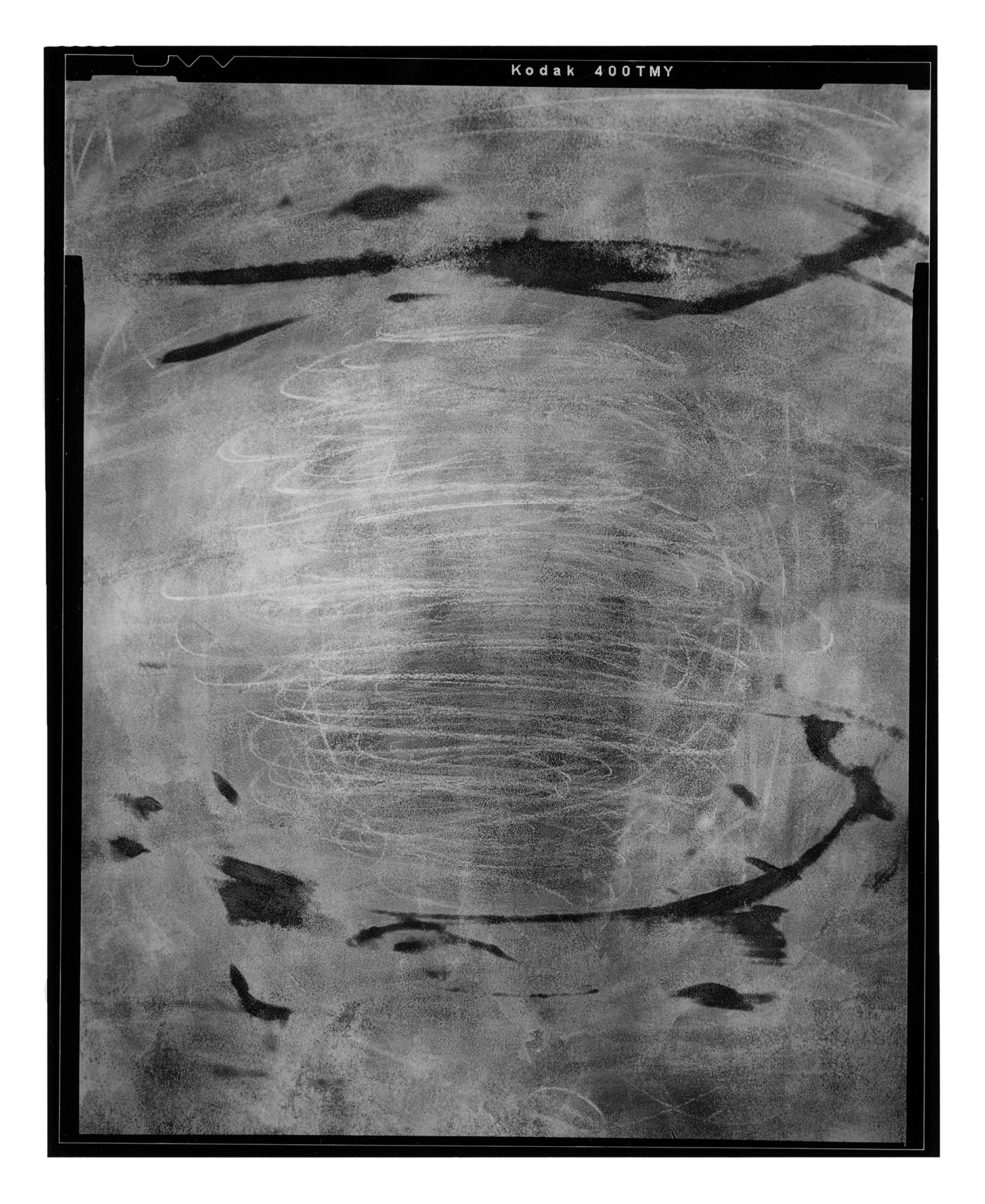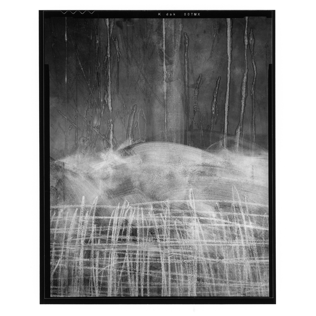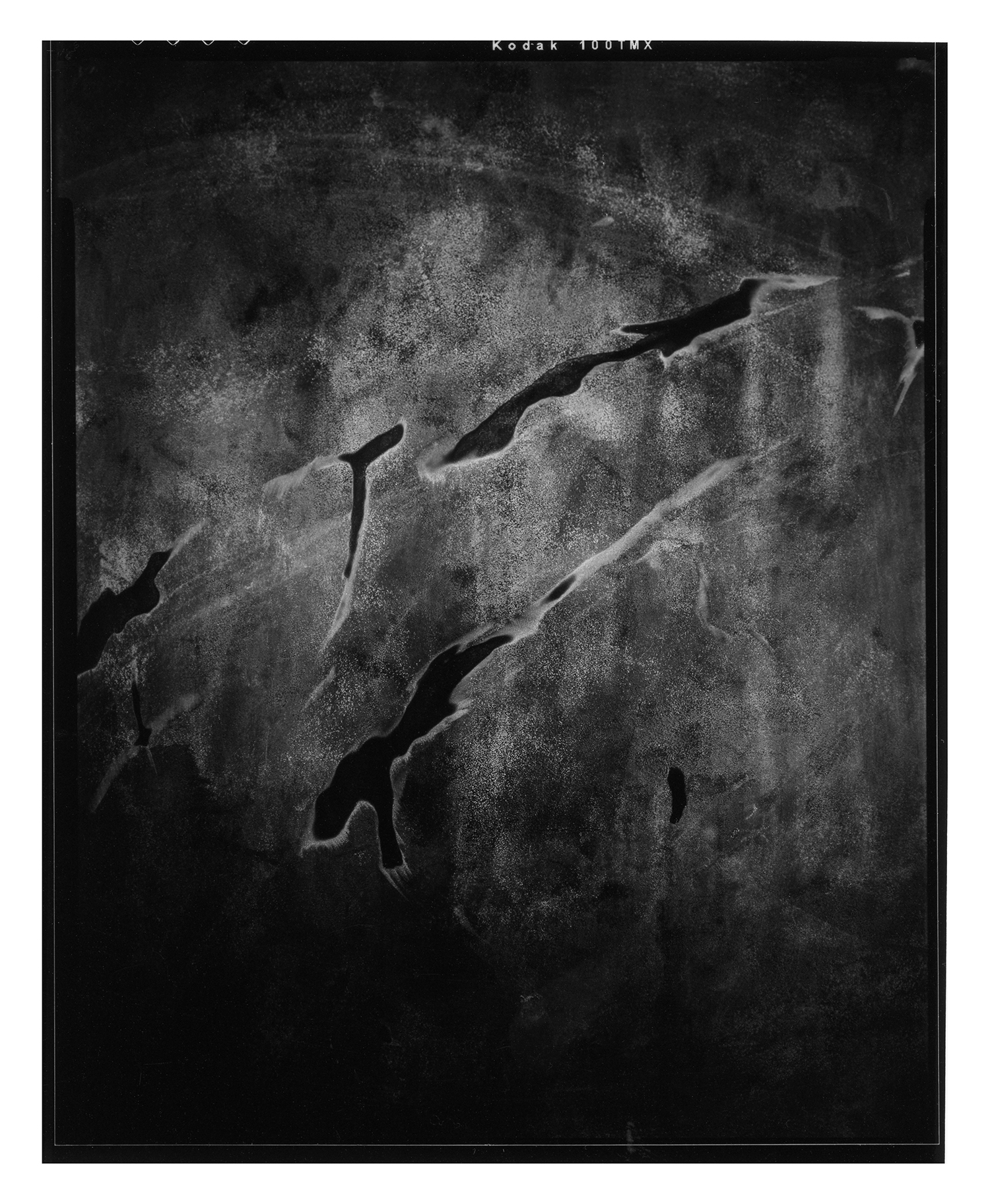 As the water dissipated and morphed, she photographed the spontaneous abstractions with 4” x 5” black and