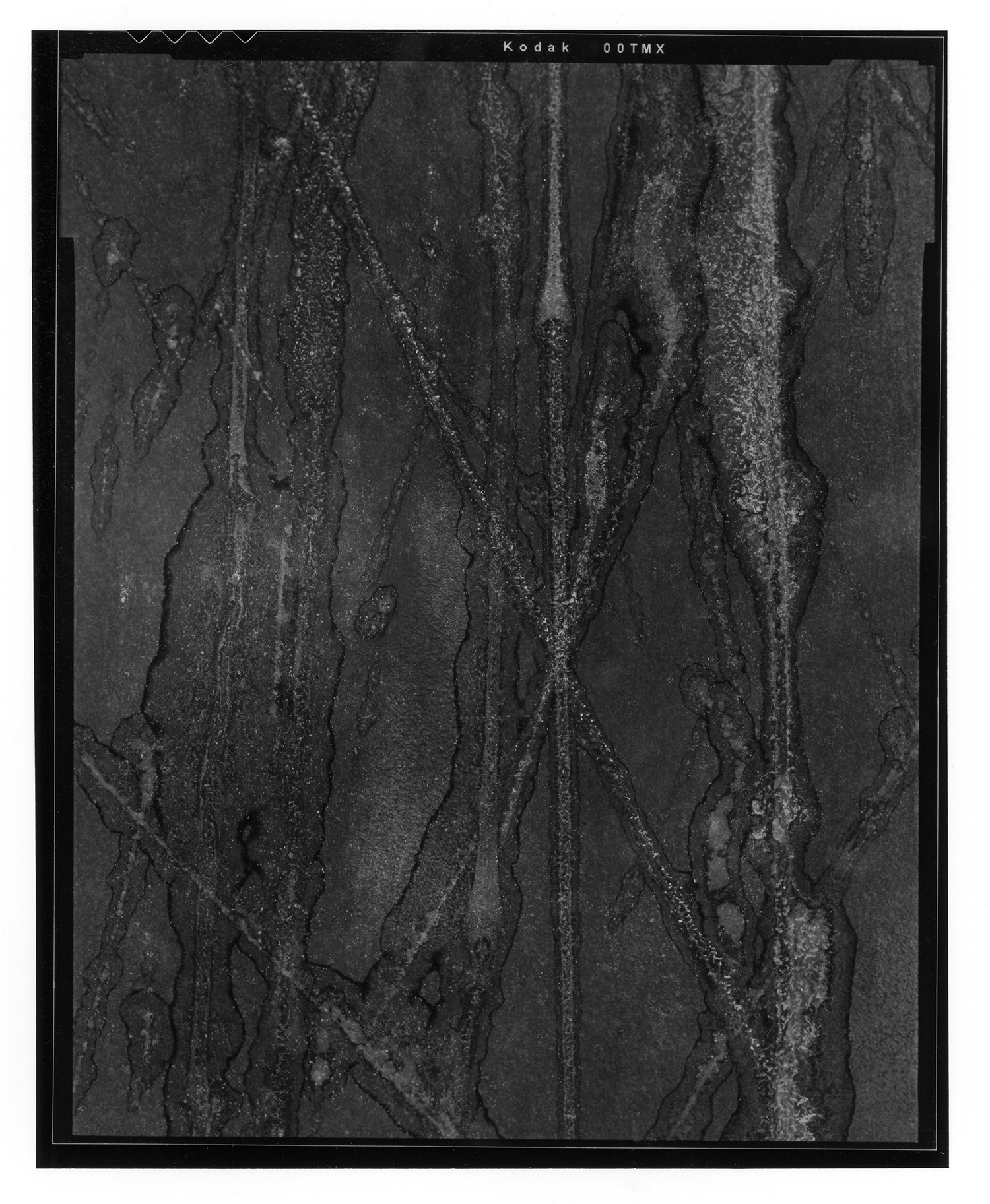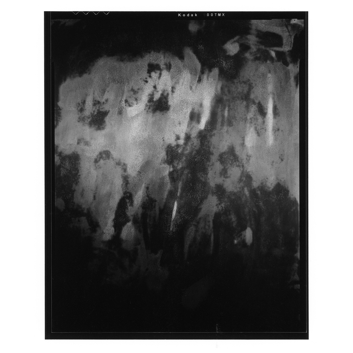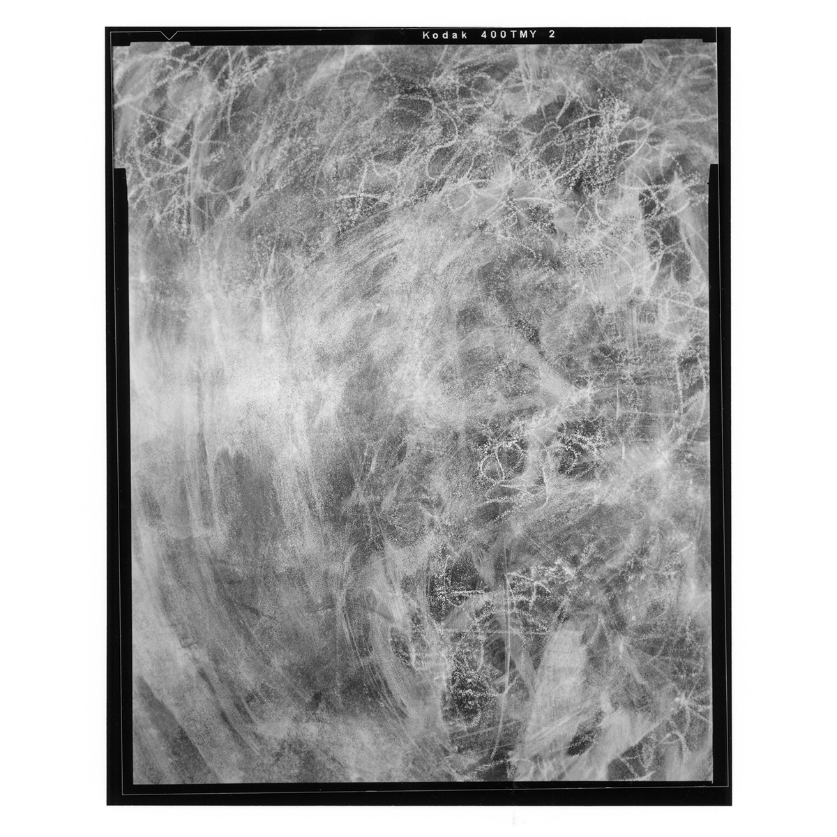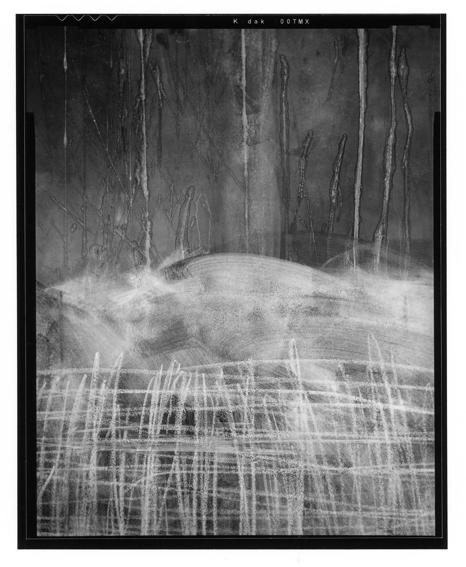 As the water dissipated and morphed, she photographed the spontaneous abstractions with 4” x 5” black and