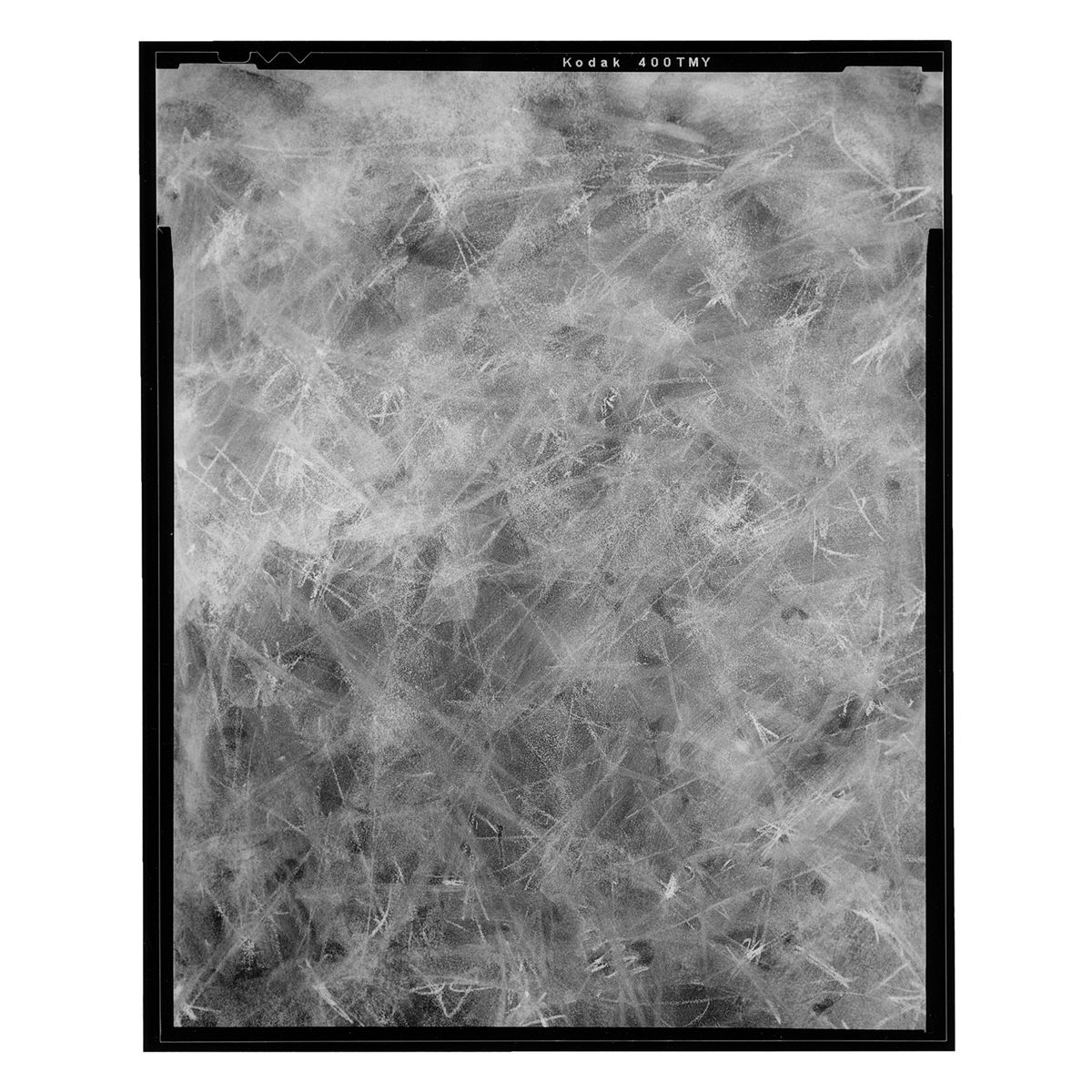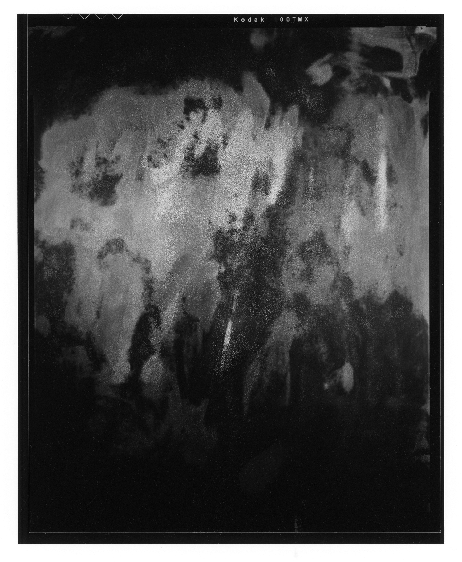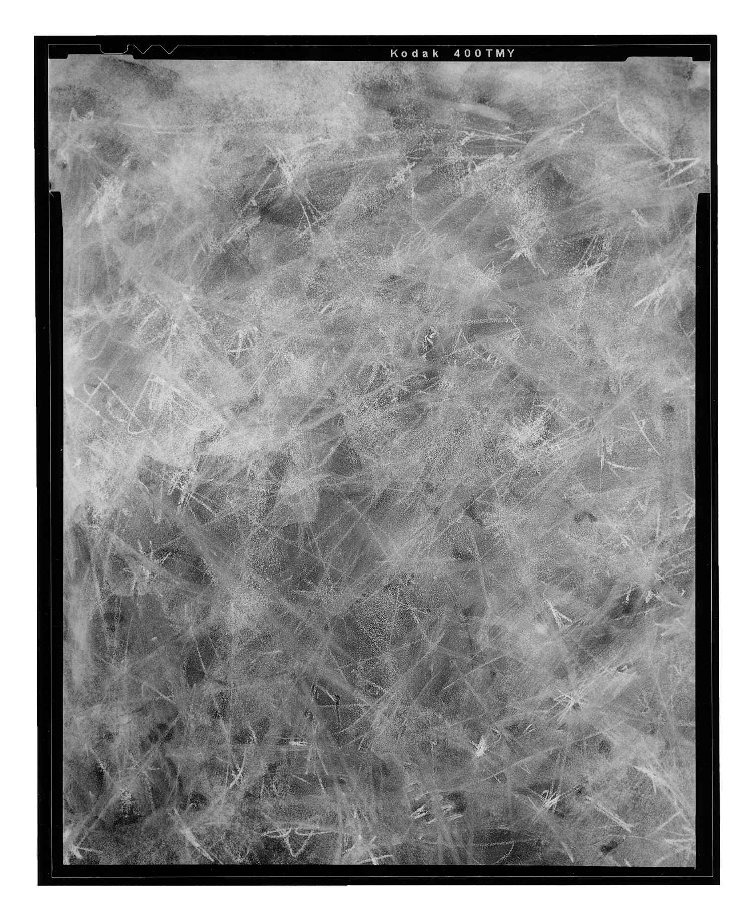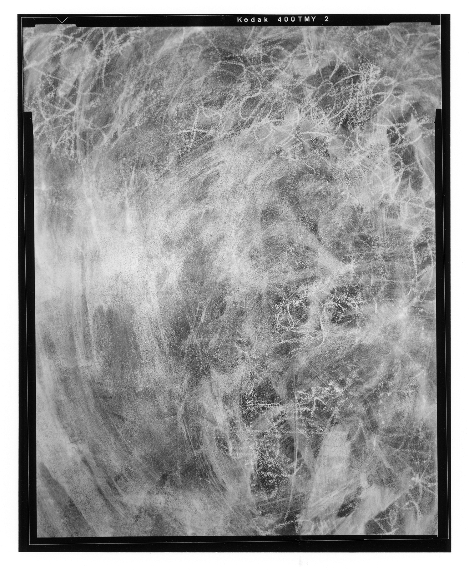 As the water dissipated and morphed, she photographed the spontaneous abstractions with 4” x 5” black and